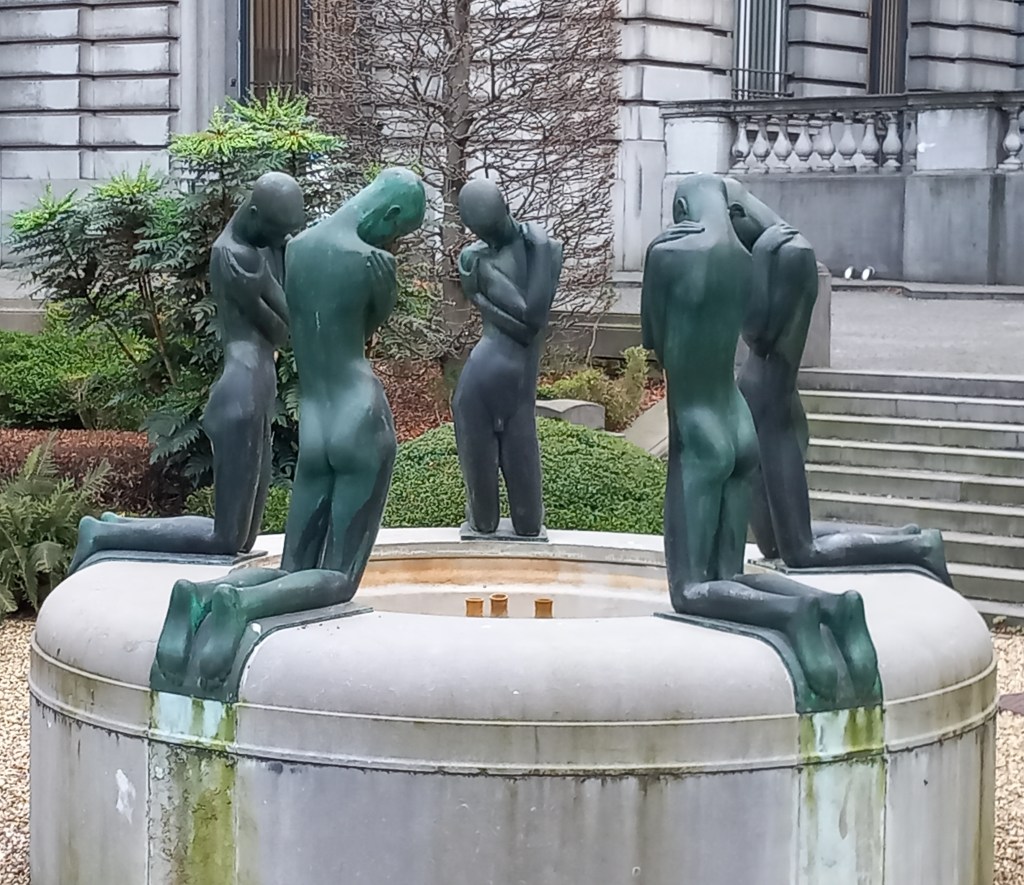 Bezoekers die via de Leuvenseweg aankomen bij het Paleis der Natie, zien achter de hekken een pleintje, omringd door straatlantaarns. In het midden ervan staat sinds 1936 de fontein “Bron der geknielden” van de Gentse beeldhouwer George Minne (fig. 11).