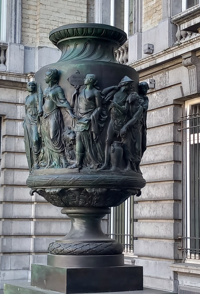 Vanaf dat moment stonden de geknielden in het gezelschap van de figuren op de monumentale bronzen vaas (fig. 12) die Charles Brunin, een in Mons geboren beeldhouwer, maakte voor de balustrade van het achterterras van het Parlementsgebouw, nadat hij in 1879 een wedstrijd hiervoor had gewonnen. De voorkant van deze 2,25m hoge vaas toont allegorische figuren van het koningschap, de wetgevende macht en het gerecht, waarrond een twintigtal burgers, vaak arbeiders, zich naar een stembus begeven. De vaas werd in brons gemaakt door de ateliers Luppens en geplaatst in januari 1883. De sokkel werd ontworpen door de ornamentkunstenaar Georges Houtstont, die ook de iets vroegere lantaarnpalen op het Leuvenseplein ontwierp.