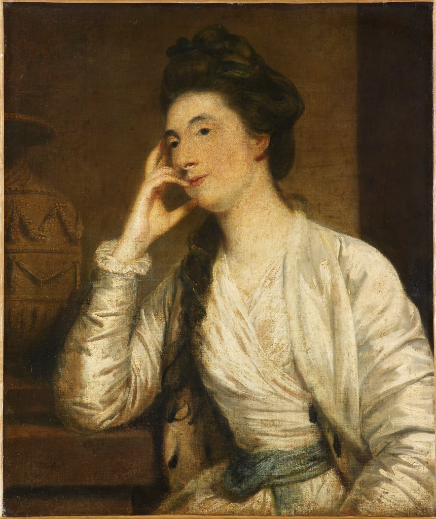 Le peintre anglais Joshua Reynolds (1723-1792) se spécialise dans l’art du portrait dès le début de sa carrière. Alors qu’il respecte les codes habituels pour les portraits d’hommes, ses portraits féminins se révèlent plus audacieux, témoignant de multiples influences artistiques. Peint vers 1767, ce portrait de Frances Godde (1735-1805) illustre les orientations nouvelles que Reynolds donne au portrait anglais dans la seconde moitié du XVIIIe siècle. Il montre le modèle dans une pose simple, voire intime – les cheveux juste attachés en une longue natte – dans une attitude rêveuse presque mélancolique, comme l’indique cette gestuelle caractéristique. Le cadrage serré et un décor neutre – on aperçoit seulement sur le côté gauche un vase antique qui donne la profondeur – renforce la proximité avec le modèle. Vêtue d’une robe et d’une veste blanches, une ceinture bleue nouée autour de la taille, ce portrait illustre aussi le retour à l’antique dans la mode anglaise, tendance vite copiée ensuite par la mode parisienne.