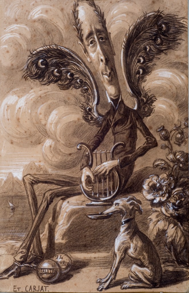 Le portrait-charge, exécuté en 1856 par Étienne Carjat, s’inspire de la très célèbre représentation d’Alphonse de Lamartine par le peintre Henri Decaisne (1799-1852). Le caricaturiste Étienne Carjat dote le poète d’une tête difforme et d’un corps allongé. Les références sont accentuées : le dramaturge est affublé des ailes de paon symbole de vanité. Il gratte la minuscule lyre de la poésie devant un lac, écho de ses succès littéraires passés. Quant à ses pieds, ils sont entravés par les boulets de la réalité politique des premiers jours de la Révolution, le 24 février 1848. Les pavots sont tout aussi évocateurs de la somnolence qu’il procure à ses auditeurs tandis que le lévrier tend une sébile évocatrice de ses perpétuels problèmes financiers. Alphonse de Lamartine, choqué, refusa à Étienne Carjat la publication du dessin au sein de sa revue satirique Le Diogène fondée en 1856. La réponse saillante d’Alphonse de Lamartine contraint Étienne Carjat à se raviser : « (…) Je ne puis autoriser sur ma personne une dérision de la figure humaine, qui, si elle n’offense pas l’homme, offense la nature et prend l’humanité en moquerie. (…) Je vous l’ai dit (…), ma figure appartient à tout le monde ; au soleil comme au ruisseau, (…) je ne veux pas la profaner volontairement car elle est présente de Dieu ». Ce dessin s’inscrit dans une longue suite de caricatures qui ont permis la renommée des revues satiriques, notamment du Charivari.
