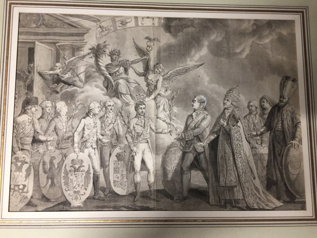 Buonaparte présente l’olivier de la paix aux puissances de l’Europe : c’est le titre sous lequel la gravure des frères Le Campion fut gravée, à partir du dessin préparatoire de Desrais présenté ici. Le genre de l’allégorie est chahuté à cette époque, car elle rappelle l’Ancien Régime ; Napoléon y est défavorable. Dans les tableaux présentés au concours de 1802 célébrant la Paix d’Amiens, des artistes mêlèrent volontiers éléments réalistes (traits du Premier Consul par exemple) à l’allégorie (cf. Bruno Foucart, « La Paix d’Amiens et les artistes », in Actes du colloque La Paix d’Amiens, Amiens, mai 2002). Desrais, qui a dessiné d’autres scènes allégoriques à graver, tente de s’adapter à cette évolution. Les nuées, qui abondent – l’artiste est un adepte du lavis – assurent une mince transition entre le premier plan, historique, et le registre allégorique, au ciel.