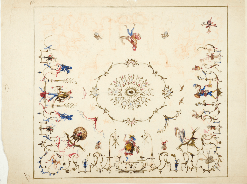 Pourtant, la collection est essentielle pour appréhender un pan entier de l’histoire des arts décoratifs en France. Neveu de Claude II Audran (1639-1684), collaborateur de Charles Le Brun (1619-1690) sur les chantiers versaillais du Roi-Soleil, Claude III Audran est l’un des décorateurs les plus prolifiques de sa génération. Tout au long de sa carrière, il travaille à l’ornementation des plus prestigieuses demeures monarchiques (Fontainebleau, Marly, Versailles), princières (Chantilly, Meudon) et aristocratiques (Anet, Sceaux, Petit-Bourg). Il œuvre aussi, pendant la Régence, à la décoration des hôtels particuliers des plus riches financiers du royaume, comme Abraham Peyrenc de Moras (1680-1732). Comparé de son vivant à Raphaël (1483-1520), Audran parvient au succès grâce à deux facteurs : d’une part, il renouvelle le genre décoratif des grotesques qui prospère depuis le XVIe siècle en y associant des éléments nouveaux comme des arabesques et des singeries et d’autre part, il travaille, grâce à sa position de Concierge du palais du Luxembourg (conservateur des peintures), avec les artistes les plus prometteurs de son temps, comme François Desportes (1661-1743), Claude Gillot (1673-1722), Christophe Huet (1700-1759), Nicolas Lancret (1690-1743), Jean-Baptiste Oudry (1683-1755), ou Antoine Watteau (1684-1721).