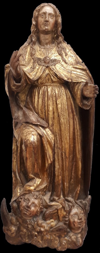Cette sculpture correspond à l’image qui sera choisie à partir du XVIe siècle pour matérialiser la Vierge Immaculée ou Immaculée Conception : celle de la femme de l’Apocalypse ou Mulier Amicta Sole (Apo. 12), décrite comme portant un vêtement de lumière, une couronne de douze étoiles et la lune sous les pieds. La couronne – probablement en tôle d’argent – qu’elle portait sur la tête, comme en témoigne les trous visibles au sommet du crâne, a malheureusement disparu. Le croissant de lune émerge des nuées et les pieds de la Vierge reposent sur des têtes d’anges. Elle illustre la dévotion mariale qui s’enracine dans l’île après le Concile de Trente et la Contre-Réforme, à travers le culte de la Vierge de l’Immaculée Conception.