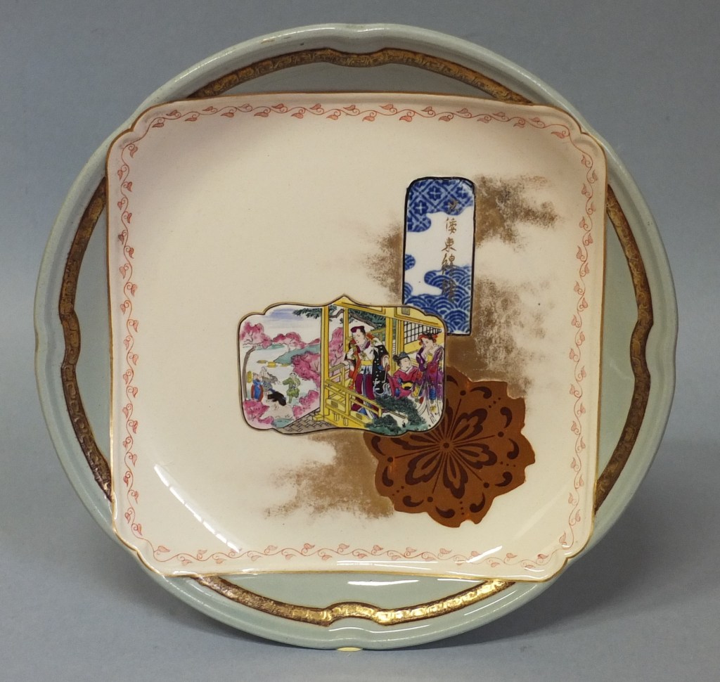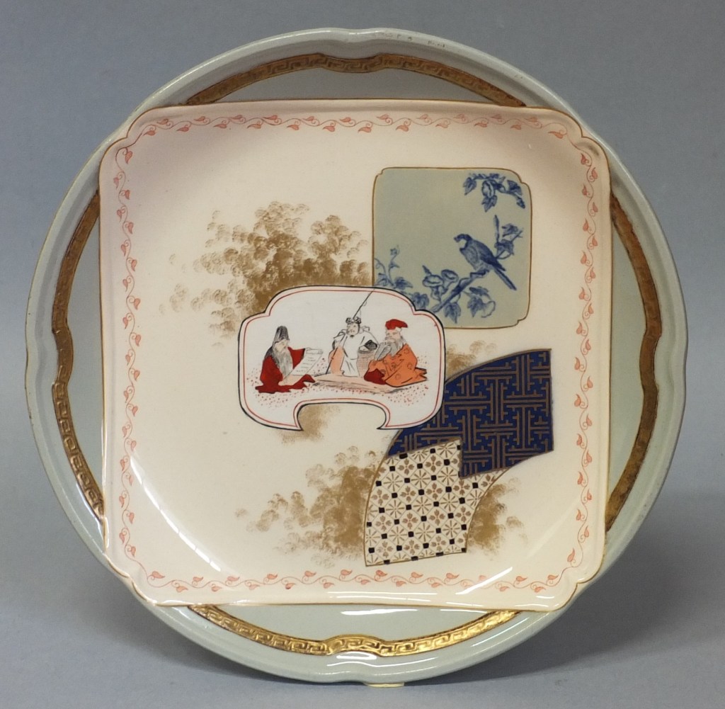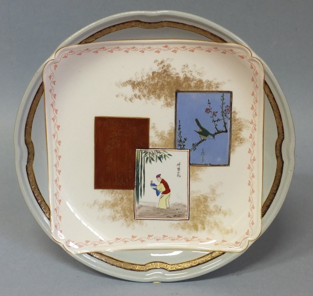 Sur le napperon sont déposées, en léger relief également, des vignettes rectangulaires, des formes d’éventail ou de tsuba (garde des armes blanches japonaises), ornées de motifs variés, d’interprétations de peintures de fleurs et d’oiseaux, de scènes et de paysages. Contrastant entre elles par le dessin et les couleurs, elles semblent flotter sur un fond d’or poudré et se superposent. Il s’agit d’un jeu esthétique employé par les graveurs japonais, appelé kibori gakuawase sanzu (« rivalité des images encadrées »). L’auteur du service a bien assimilé ce principe et l’a rendu avec une rare sensibilité qui fait de Kioto une création d’un grand raffinement, loin des facilités de la production industrielle contemporaine que se contentait de transposer des motifs d’Extrême-Orient sur des formes occidentales.