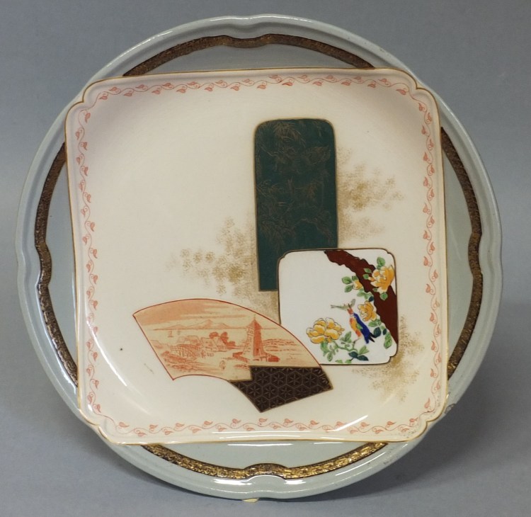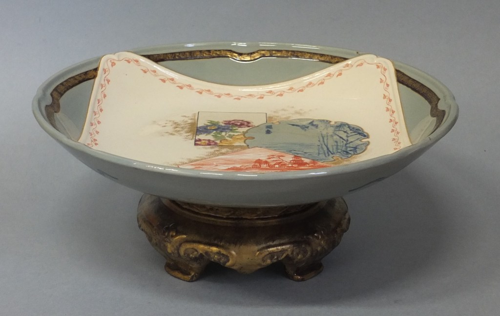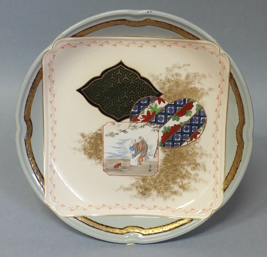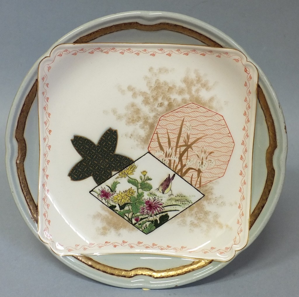 Sur le napperon sont déposées, en léger relief également, des vignettes rectangulaires, des formes d’éventail ou de tsuba (garde des armes blanches japonaises), ornées de motifs variés, d’interprétations de peintures de fleurs et d’oiseaux, de scènes et de paysages. Contrastant entre elles par le dessin et les couleurs, elles semblent flotter sur un fond d’or poudré et se superposent. Il s’agit d’un jeu esthétique employé par les graveurs japonais, appelé kibori gakuawase sanzu (« rivalité des images encadrées »). L’auteur du service a bien assimilé ce principe et l’a rendu avec une rare sensibilité qui fait de Kioto une création d’un grand raffinement, loin des facilités de la production industrielle contemporaine que se contentait de transposer des motifs d’Extrême-Orient sur des formes occidentales.