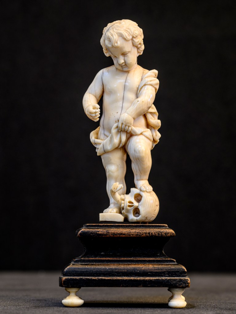 Il s’agit d’un memento mori, autrement dit Souviens-toi que tu vas mourir. Ce petit objet rappelle à l’homme sa condition de mortel, sa mort prochaine pour l’éloigner de la vanité, de l’orgueil et du narcissisme. Le memento mori est un genre artistique très en vogue en Occident entre le XVe et le XVIIIe siècles. Dans le genre pictural, il prend le nom de « vanité » et la forme d’un crâne, symbolisant la mort prochaine. En sculpture, il prend aussi la forme d’un crâne souvent traversé par un serpent incarnant la mort. Dans cette œuvre du musée de Dinan, la figure de l’Amour, sous les traits d’un enfant vêtu d’un voile, écrase de son pied la Mort, figurée par un crâne dont un serpent sort de la bouche. Ce memento mori est-il un message d’espoir ? L’amour peut-il triompher de la mort ?