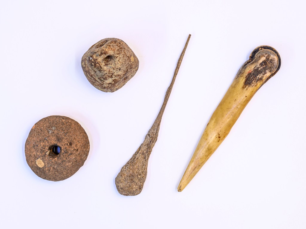 Deux autres objets témoignent de la technique du tissage des vêtements (ill. 2). Cette technique plus complexe exige patience et précision. Les parties produites en tissage sont plus petites (ceintures, bracelets, bordures de vêtements) et plus précieuses. La fusaïole témoigne de la fabrication du fil à partir d’une boule de laine. Enfin, le peson sert à tendre les fils du métier à tisser.