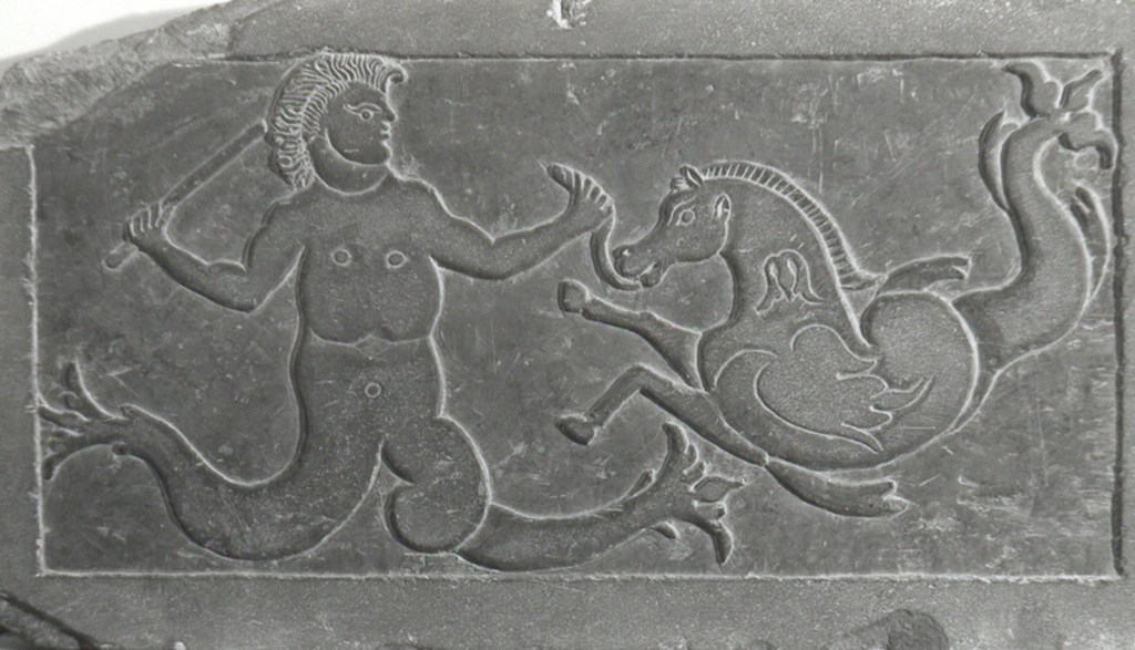 Le décor de cette plaque se compose de deux figures : à droite, on reconnaît un cheval à queue de poisson autrement dit un hippocampe ou « cheval marin » ; à gauche, se trouve un homme, au buste prolongé par deux queues de poisson. Il s’agit d’une représentation de la divinité grecque Triton. Fils de Poséidon et d’Amphitrite, Triton avait le pouvoir de déchainer ou de calmer les flots, selon son humeur, en soufflant dans sa conque. Le décor respecte l’iconographie traditionnelle. En effet, le dieu Triton tient dans une main une conque, coquillage dans lequel il souffle pour ordonner ses commandements. Dans la main gauche, il tient un gouvernail, pour parcourir les mers.