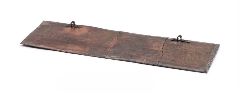 Cette plaque horizontale, aujourd’hui cassée en trois fragments, mesure 68,2 cm de longueur, 22,5 à 22,8 cm de largeur et 0,4 cm d’épaisseur. Une légère moulure puis un double filet soulignent le contour du recto. Elle pèse 6 730 g. Le bronze, de grande qualité, est dépourvu de défaut de fabrication. La feuille d’argent qui la recouvre encore partiellement est repliée au verso, formant un rabat de 3,7 cm. Il s’agit donc d’une « fausse argenture », par des feuilles d’argent plaquées sur le métal au repoussé, ce travail s’effectuant à froid. Enfin, au verso et en partie supérieure de la plaque, deux attaches en oméga (µ) témoignent du mode de fixation ; elles sont maintenues par deux rivets de fer, espacés de 3,7 cm (Fig. 2).