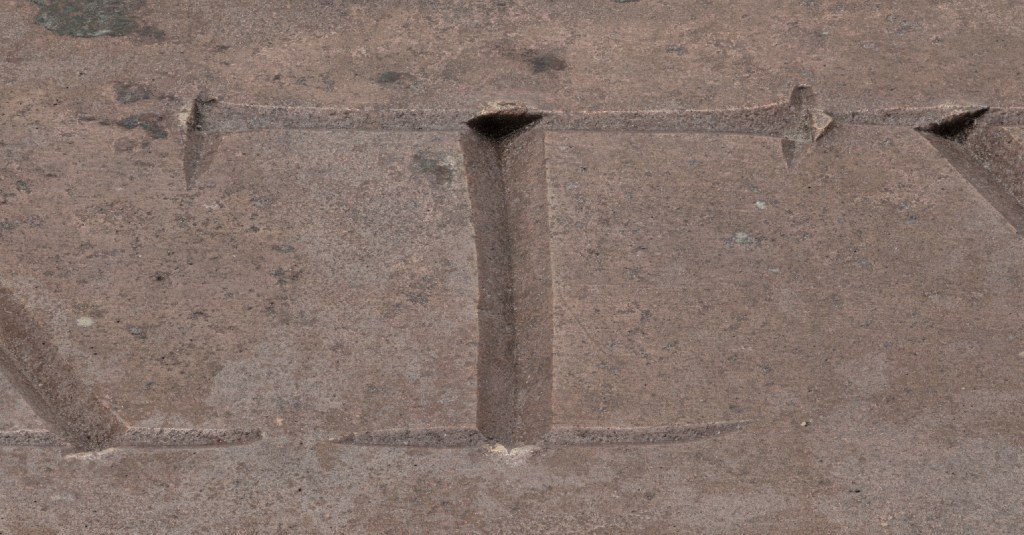 L’inscription, sur quatre lignes, est intégralement conservée (Fig. 3). Les lettres ont été gravées avec une gouge à section triangulaire ; la largeur du tracé atteint parfois 4 mm (Fig. 4). À l’extrémité de nombreux traits verticaux, nous observons un petit bulbe de métal repoussé ; celui-ci trahirait une gravure à chaud ou dans une matière malléable, comme la cire.