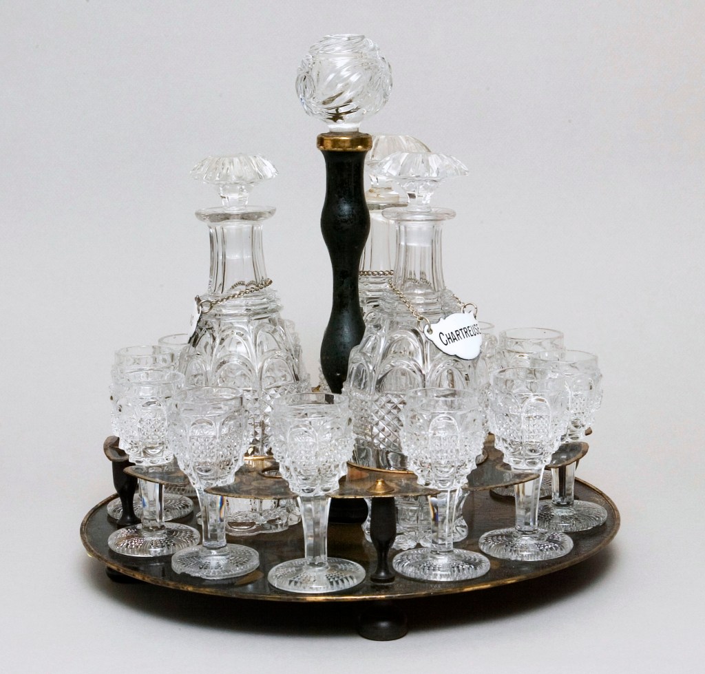 Ce cabaret, dit aussi « porte-liqueurs », appartient à la production massive d’objets en tôle peinte, de prix raisonnable, qui permit à de nombreux Français de s’équiper en biens de consommation courante au début du XIXe siècle. La verrerie est en cristal pressé-moulé, technique inventée en France en 1823 et industrialisée aux États-Unis en 1827, qui fit chuter les prix. La consommation des liqueurs fines spiritueuses était au XVIIIe siècle un plaisir raffiné, accessible seulement aux plus riches. Sirupeuses et parfumées, on donnait à ces boissons le nom de « crèmes », et leurs ingrédients, cannelle, badiane, vanille, rhum, jasmin, rose, abricot, citron, moka, fleur d’orange au petit-lait ou au champagne, thé… expliquent leur prix élevé. Elles étaient obtenues par macération de fruits, de fleurs, de plantes et d’épices dans les meilleures eaux de vie avec du sucre. En outre, on les laissait vieillir en cave afin d’en bonifier le goût par le développement des arômes. Sous l’Ancien Régime, ces boissons, conservées sous clefs dans des coffrets, étaient un grand luxe : « On ne les servoit qu’à la suite d’un grand repas, en petite quantité, dans de très petits verres » (Grimod de La Reynière, Almanach des gourmands, tome II, p. 197). L’essor de la profession de distillateur après 1790 accompagna une évolution du goût des consommateurs en faveur des liqueurs fortes, comme le kirsch. L’engouement fut tel vers 1800 que les liqueurs devinrent presque une denrée de première nécessité. Les plus communes étaient la crème d’absinthe, l’anisette de Bordeaux, le marasquin de Zara, le curaçao d’Amsterdam, le ratafia de Grenoble, le kirchswasser de Verdun, la liqueur de noyau et la crème de fleur d’orange. Chaque ménage détenait deux, trois ou quatre liqueurs différentes, offertes aux convives en fin de repas avec le café et des biscuits à tremper dans le verre. C’est pour répondre à ce courant de mode que l’on créa vers 1800 le cabaret à liqueurs avec sa ronde de petits verres tout autour du support. Vers 1820 apparaît la « cave à liqueurs », coffret de bois plus ou moins précieux et décoré, aux parois articulées, permettant de tenir les flacons sous clef à l’abri des tentations du personnel domestique.
